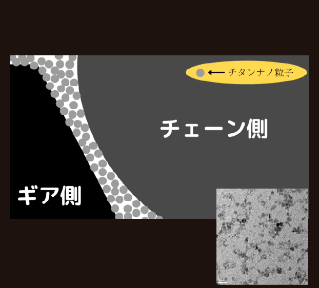 酸化チタンをナノ粒子にし、それを高度な分散化技術で使用可能な状態にした後、クレストヨンド社による施工技術により、チェーンに最適な形でチタンナノ粒子を配置させることができる。